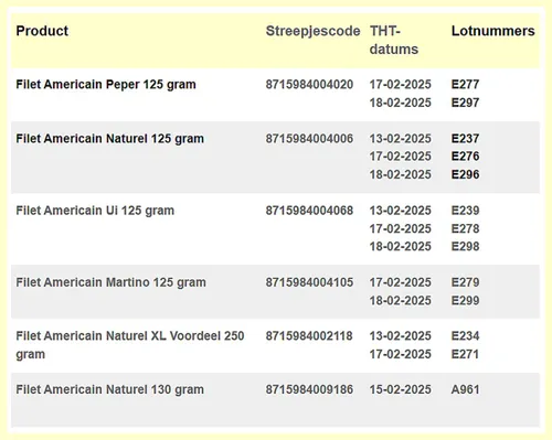 Als u filet americain van Ladesse heeft gekocht, controleer dan goed de houdbaarheidsdatum en het lotnummer. Als deze overeenkomt met een in de tabel genoemde datum of code, eet deze filet americain dan niet!
