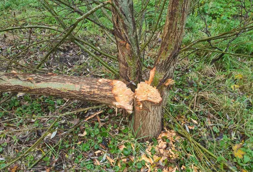 Wat minder leuke ontdekkingen waren dat er door een groep ernstige beschadigingen aan bomen zijn aangericht. Een esdoorn van 20m hoog en 25 cm diameter was deels doorgehakt met een bijl, in de levende hut en in het speellabyrint was ook van alles stuk gehakt en een grote wilg was volledig door gekapt. (foto hieronder). Het leek wel of hij door een bever was doorgeknaagd.