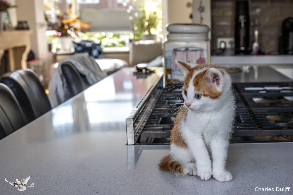 Het zou ruim twee uur duren voordat hij voorzichtig zijn knappe koppie weer liet zien en schichtig begon aan verkenning van zijn nieuwe omgeving. Zo begon een spannend avontuur, zeker ook voor mij. In de eerste plaats de kattenbak. Daar was hij helemaal niet aan gewend. Ik schreef het al, hij had er wel één, maar ging altijd naar buiten om zijn behoefte te doen.