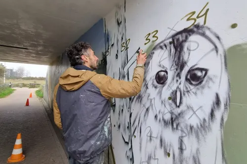In opdracht van PWN voorziet hij de wanden van de tunnel van muurschilderingen, waarin een duinlandschap tot leven komt met vogels,