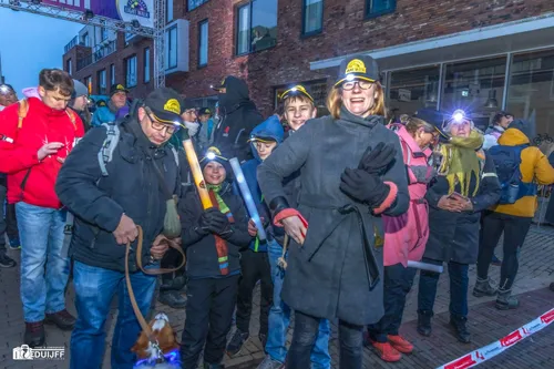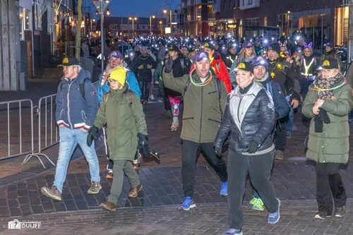 de start ontvingen wandelaars een pet met lampje, die massaal werd gedragen en