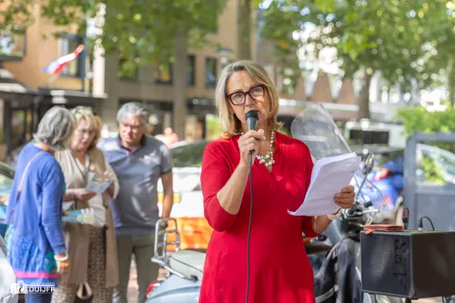 "Lady in Red" Kunstenares Vera Bruggeman (en mede organisator) kan tevreden zijn met deze ludieke promo en zonder twijfel uitzien naar een geslaagd festival zondag 8 september.
