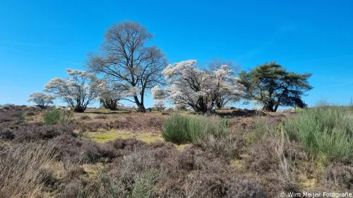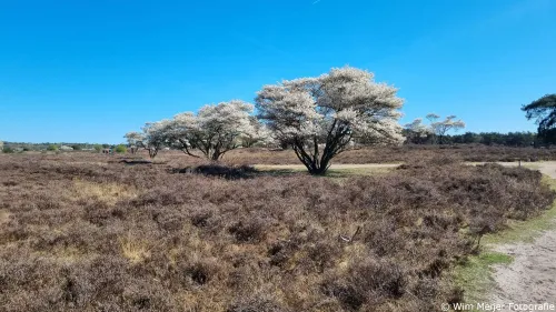 Maar vooral ook veel wit op de heide. Wit, door de vele krentenbomen, ofwel de amelanchieren. De boom heeft een aantrekkelijke en sierlijke uitstraling, vooral in de lente wanneer hij bloeit met mooie witte bloemen. De bloei duurt 2 tot drie weken, dus wil je meegenieten van deze bloesempracht dan moet je niet te lang wachten.